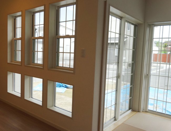 上げ下げ窓も掃出し窓も格子付きデザインで統一感を持たせています